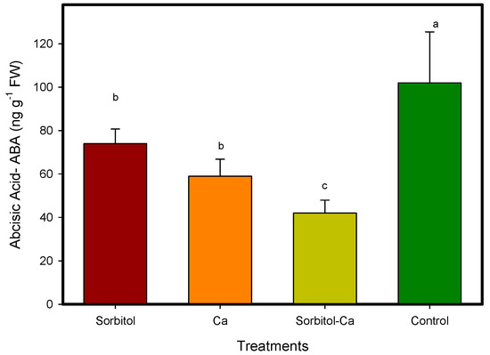 ABA content (ng g−1) in table grape berries treated with sorbitol, Ca, sorbitol–Ca, and control at harvest. Data are the mean ± SE of three samples for each replicate and treatment. Different letters indicate significant differences between treatments.