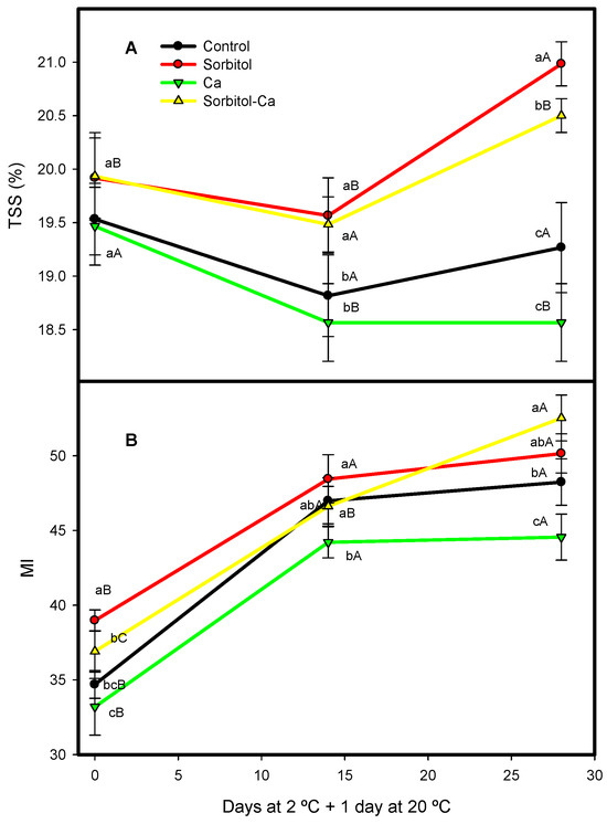 TSS (%) (A) and maturity index (MI) (B) of table grape treated with sorbitol (red), Ca (green), sorbitol–Ca (yellow), and control (black) during storage at 2 °C plus 1 day at 20 °C. Data are the mean ± SE of three samples for each replicate and treatment. Different lowercase letters indicate significant differences between treatments on the same sampling day, and different uppercase letters indicate significant differences between samples of the same treatment on different storage days.