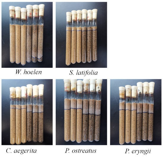 2.6. Growth Test of Edible Mushroom-Forming Fungi on Pine Wood Sawdust