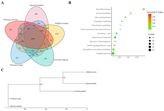 - Kim, B.; Min, B.; Han, J.G.; Park, H.; Baek, S.; Jeong, S.; Choi, I.G. Draft Genome Sequence of the Reference Strain of the Korean Medicinal Mushroom Wolfiporia cocos KMCC03342. Mycobiology 2022, 50, 254–257. [Google Scholar] [CrossRef] [PubMed]