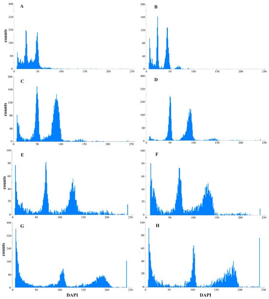 - Huang, M.G.; Shen, N.; Liu, X.Y.; Wu, X.S.; Chen, A.P.; Meng, Y.; Hu, X.G.; Tong, Z.K.; Huang, H.H.; Lou, X.Z. Identification of Chromosomal Ploidy and DNA Content in Betula by Flow Cytometry. J. Southwest For. Univ. 2023, 43, 49–57. [Google Scholar]