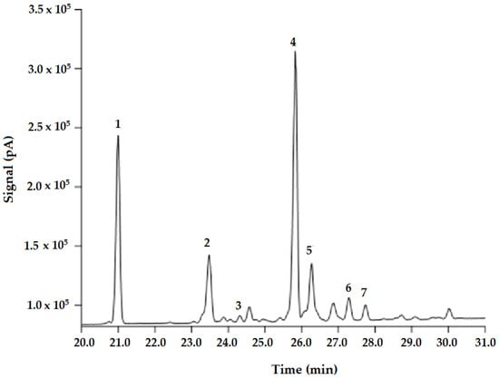 After cooling to room temperature, 400 µL of isooctane were added, and the vial content was mixed and subjected to GC-MS with a scanning regime 50–500 m/z using HP-5 ms column 30 m × 250 µm × 0.25 µm (Agilent Technologies, Lexington, MA, USA), with helium as a carrier gas and 2.8 mL min−1 flow rate. The gas flow from the column was split between the detector in the ratio 1:1. The temperature program of 230 °C was held for 5 min, ramped at 2 °C min−1 to 280 °C, and held for 15 min. The GC-FID chromatogram of sterol trimethylsilyl derivatives is shown in Figure 1.