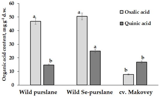 Oxalic and quinic acid content in purslane leaves. For each organic acid, values with the same letters do not differ statistically according to Duncan’s test at p < 0.05. Bars indicate the standard deviation.