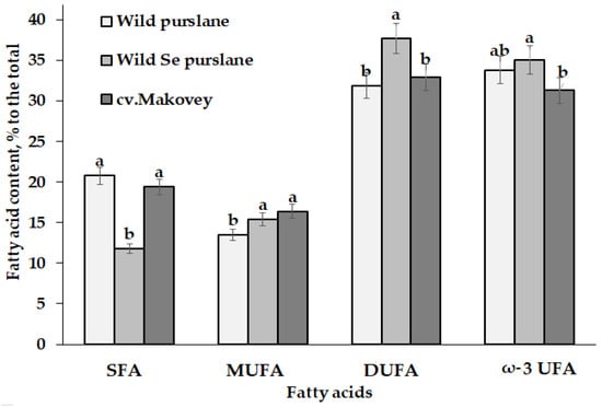 Fatty acid profile of cultivated parsnip and wild accession fortified and unfortified with Se. SFA—saturated fatty acids; MUFA—mono-unsaturated fatty acids; DUFA—di-unsaturated fatty acids; ω-3 UFA—ω-3 unsaturated fatty acids. For each group of fatty acids, values with the same letters do not differ significantly according to Duncan’s test at p < 0.05. Bars indicate the standard deviation.