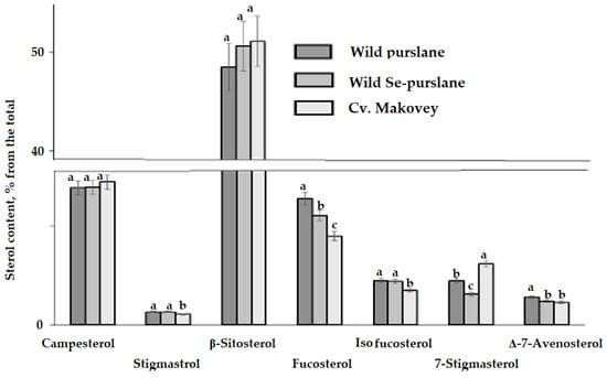 Sterol profile of purslane seed oil. Within each compound, values with the same letters do not differ significantly according to Duncan’s test at p < 0.05. Bars indicate the standard deviation.