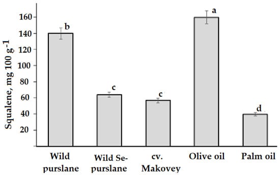 Both squalene and phytosterols participate in plant growth and adaptation to environmental stresses, providing a powerful antioxidant defense [65]. Squalene is a strong antioxidant, antitumor agent and a natural antibiotic with high prospects for utilization in human nutrition, cosmetics and medicine [66]. The present results showed squalene levels in purslane seed oil of 57–140 mg 100 g−1 (Figure 5). These values are much higher than those described for purslane leaves and stems (0.115 mg 100 g−1) [67]. Other natural sources of squalene include olive oil (150–170 mg 100 g−1) [68], palm oil (25–54 mg 100 g−1) [69], and amaranth oil (6000–8000 mg 100 g−1) [70].