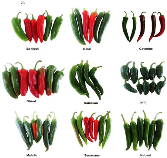 The field experiments were conducted over two consecutive growing seasons in 2022 and 2023 at the Research and Experimental Station of Teboulba, Monastir, Tunisia (35.637178, 10.957276). The study utilized nine hot pepper landraces: ‘Dhirat’, ‘Semmane’, ‘Jerid’, ‘Mahdia’, ‘Cayenne’, ‘Baklouti’, ‘Nabeul’, ‘Kairouan’, and ‘Beldi’, which were selected and maintained by the Laboratory of Horticultural Crops at the National Agricultural Research Institute of Tunisia (Figure 1).