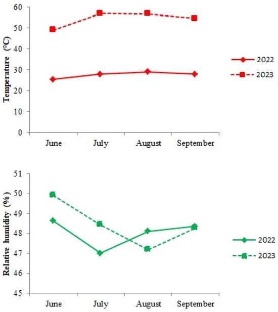 The experimental design employed a randomized complete block with three replicates (blocks) each year. Throughout the growing seasons of 2022 and 2023, the average temperature ranged between 25–33 °C and 20–34 °C, respectively. Relative humidity varied between 55–88% in 2022 and 56–90% in 2023, while rainfall ranged from 0–5 mm and 0–15 mm during the respective years (Figure 2).