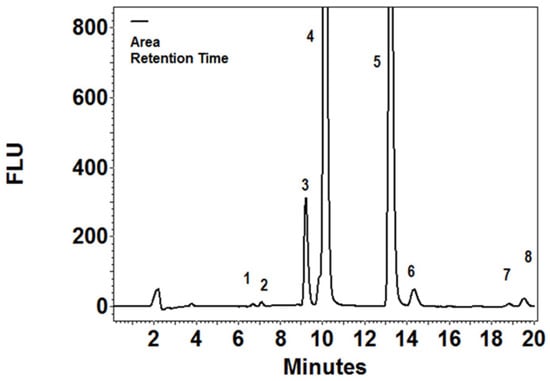 Capsaicinoid content was determined following the methods of Daood et al. [29] and Duah et al. [3]. Briefly, three grams of pepper homogenate were crushed with quartz sand in a crucible mortar. Then, 50 mL of analytical-grade methanol was added, and the mixture was transferred into a 100 mL Erlenmeyer flask fitted with a stopper. After three minutes of ultrasonication, the mixture was filtered through Whatman No. 1 paper. The filtrate was further filtered using a 0.20 µm PTFE syringe filter (Chromfil Xtra, Macherey-Nagel, Düren, Germany) into vials after being diluted ten times (9:1 by vol.). Using an Eppendorf pipette, 1 mL of methanol and 1 mL of the filtrate (from the syringe filter) were further diluted into vials. HPLC separation of capsaicinoids was performed on a Purospher C18, 2.7 μm, 150 × 4.6 mm column with isocratic elution using 48:52 water-acetonitrile at a flow rate of 0.8 mL min−1. The compounds were detected fluorometrically, with exitation at 285 nm and emission at 320 nm. Capsaicinoids were identified and quantified based on the retention times (Figure 3) and calibration curves of external standards (capsaicin, dihydrocapsaicin, and nordihydocapsaicin), with their content expressed as mg kg−1 fw.