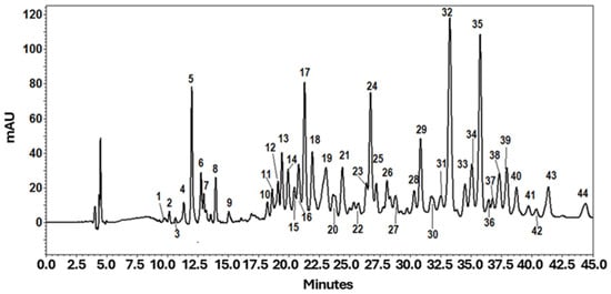 Figure 4. HPLC profile of carotenoids from pungent red pepper fruit. Peak identification: 1: capsorubin, 2: 2,5-dihydroxykarpaxanthin, 3: violaxanthin, 4: capsanthin epoxide, 5: capsanthin, 6: cucurbitaxanth, 7: cis-capsanthin, 8: zeaxanthin, 9: β-cryptocapsin, 10: β-cryptocapsin ME, 11: cucurbitaxanthin ME, 12: β-cryptoxanthin, 13: capsanthin epoxide ME, 14: capsanthin ME, 15: antheraxanthin ME, 16: cis-capsanthin ME, 17: capsanthin ME, 18: antheraxanthin ME, 19: cis-capsanthin ME, 20: capsanthin ME, 21: antheraxanthin ME, 22: β-cryptocapsin ME, 23: ζ-carotene, 24: β-carotene, 25: capsorubin DE, 26: cis-β-carotene, 27: capsorubin DE, 28: cis-capsorubin DE, 29: capsanthin DE, 30: β-cryptoxanthin ME, 31: cis-capsanthin DE, 32: capsanthin DE, 33: capsanthin DE, 34: cis-capsanthin DE, 35: capsanthin DE, 36: zeaxanthin DE, 37: cis-capsanthin DE, 38: cis-capsanthin DE, 39: capsanthin DE, 40: zeaxanthin DE, 41: cis-capsanthin DE, 42: cis-capsanthin DE, 43: zeaxanthin DE, 44: cis-zeaxanthin DE. (ME = monoester; DE = diester).