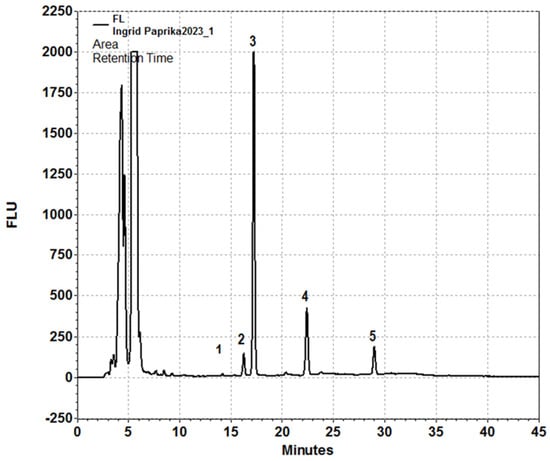 An HPLC system (Hitachi Chromaster, Tokyo, Japan) equipped with a 5110 Pump, a 5210 Auto Sampler, a 5430 Diode Array Detector, and a 5440 Fluorescence Detector was used for compound analysis. Carotenoids and tocopherols were separated using a Nucleodur C18, 3 µm, 240 × 4.6 mm column (Machery Nagel, Dürer, Germany) with a gradient elution starting from 7% water in methanol, transitioning to methanol/2-propanol-acetonitrile (10:90, v/v) at a constant flow rate of 0.6 mL min−1. Carotenoids were detected within the wavelength range of 190 to 700 nm, and their concentrations were expressed as mg kg−1 fw. Individual carotenoid peaks were identified based on the retention times of external standards (Figure 4). All chemicals, including carotenoid standards, analytical and HPLC-grade solvents, were purchased from VWR (Budapest, Hungary, and Darmstadt, Germany). Tocopherols were detected using a fluorescent detector with excitation and emission wavelengths set at 295 nm and 325 nm, respectively. Isomers of α-, β-, and γ-tocopherols were identified using external standards (Sigma-Aldrich, Budapest, Hungary) (Figure 5), and their contents were expressed as mg kg−1 fw.