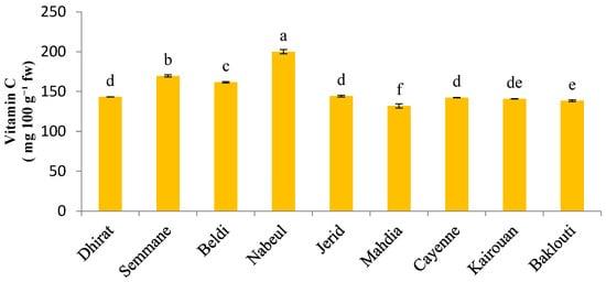 Total vitamin C content in different hot pepper landraces harvested at the red-ripe stage is presented in Figure 6. The total vitamin C content varied significantly (p < 0.05) among pepper landraces. Across the study, total vitamin C ranged from 132 mg 100 g−1 fw in ‘Mahdia’ to 200 mg 100 g−1 fw in ‘Nabeul’, with variations ranging from 4% to 51% compared to ‘Mahdia’, indicating relatively low variability among the analyzed pepper landraces. Landraces ‘Jerid’, ‘Dhirat’, and ‘Cayenne’ showed statistically similar intermediate total vitamin C levels.