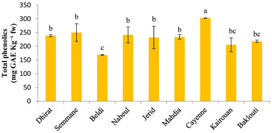 Total phenolics in different hot pepper landraces harvested at the red-ripe stage are presented in Figure 7. The content of total phenols varied significantly (p < 0.05) among the analyzed hot pepper landraces. Total phenolics content ranged from 168.58 mg GAE kg−1 fw in ‘Beldi’ to 302.98 mg GAE kg−1 fw in ‘Cayenne’, with variations ranging from 22% to 80% compared to ‘Beldi’, indicating substantial variability among the analyzed pepper landraces. ‘Dhirat’, ‘Semmane’, ‘Nabeul’, ‘Jerid’, and ‘Mahdia’ demonstrated statistically similar intermediate total phenolic values.