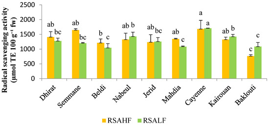 The RSAHF and RSALF measured in different hot pepper landraces are presented in Figure 8. The RSAHF and RSALF values varied significantly (p < 0.05) among the studied pepper landraces. RSAHF values ranged from 763.31 µM Trolox 100 g−1 fw in ‘Baklouti’ to 1680.27 µM Trolox 100 g−1 fw in ‘Cayenne’, with variations spanning from 59% to 120% compared to ‘Baklouti’. Conversely, RSALF values ranged from 1043.85 µM Trolox 100 g−1 fw in ‘Beldi’ to 1707.28 µM Trolox 100 g−1 fw in ‘Cayenne’, exhibiting variations ranging from 4% to 63% compared to ‘Beldi’. While the landrace ‘Cayenne’ displayed the highest values for both RSAHF and RSALF, ‘Baklouti’ statistically ranked the last for both traits.
