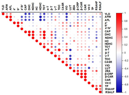 Figure 9. Pearson correlation matrix between agronomic, physico-chemical, and functional quality attributes of the hot pepper landraces under investigation. Reddish tones express higher positive correlations, whereas blueish tones indicate negative correlations. Larger circle diameters denote higher modules of the correlation coefficient (r). White intersections exhibit non-significant correlations (significance was set at p correlation). Abbreviations: YLD, yield per plant; AFW, average fruit weight; AFL, average fruit length; TA, titratable acidity; a*, redness; b*, yellowness; (a*/b*), a*/b* ratio; CAP, capsaicin; DHC, dihydrocapsaicin; NDHC, nor-dihydrocapsaicin; HC, homocapsaicin; HDHC, homodihydrocapsaicin; TOT, total capsaicinoids; α-T, α-tocopherol; β-T, β-tocopherol; γ-T, γ-tocopherol; TOC, total tocopherols; CASR, capsorubin; VIO, violaxanthin; LUT, lutein; ZEA, zeaxanthin; β-CRP, β-cryptoxanthin; β-CAR, β-carotene; CAR, total carotenoids; Vit C, Vitamin C; TP, total phenols; RSAHF, radical scavenging activity of the hydrophilic fraction antioxidant activity; RSALF, radical scavenging activity of the lipophilic fraction.