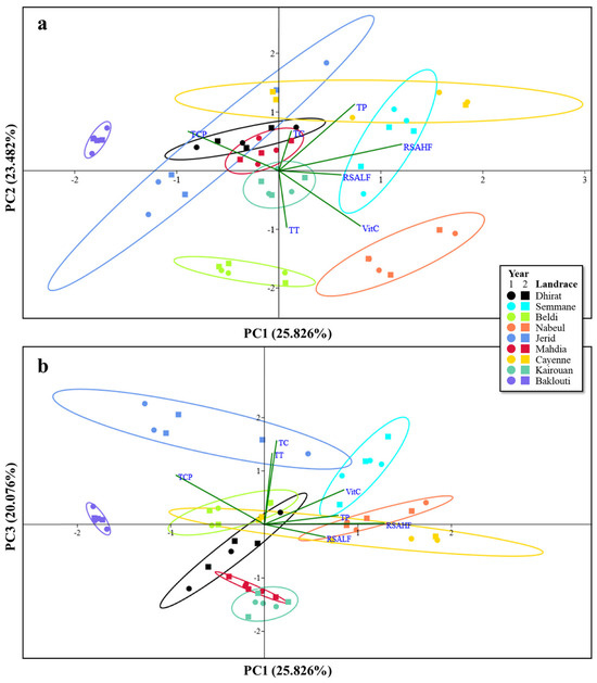 Figure 10. Principal component analysis (PCA) biplots PC1 vs. PC2 (a) and PC1 vs. PC2 (b) of the main bioactive classes of molecules (total contents) identified in the different pepper genotypes under investigation. The variance (%) explained by each PCA axis is given in brackets. The length of the vectors is correlated to their significance within each population. Between vectors and between a vector and an axis, there is a positive correlation if the angle is <90°, whereas the correlation is negative if the angle is >90°. There is no linear dependence if the angle is 90°. Ellipses enclose the 75% confidence interval. Abbreviations: TCP, total capsaicinoids; TP, total phenols; TT, total tocopherols; TC, total carotenoids; Vit C, total Vitamin C; RSALF, radical scavenging activity of the lipophilic fraction; RSAHF, radical scavenging activity of the hydrophilic fraction.
