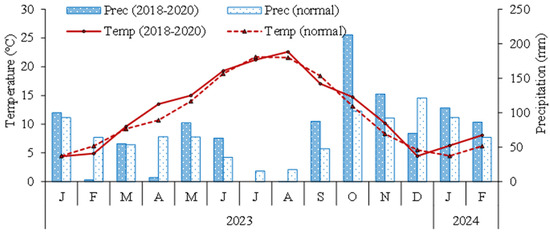 Climatological normal data for the region (1981–2010) and monthly average air temperature and precipitation during the experimental period.