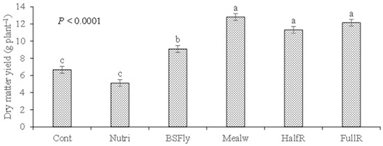 Dry matter yield of lettuce across fertilization treatments [control (Cont), Nutrimais (Nutri), black soldier fly larvae frass (BSFly), mealworm larvae frass (Mealw), half the rate ammonium nitrate (HalfR), full rate of ammonium nitrate (FullR)] in the first growing cycle. Means with the same letter are not significantly different (Tukey’s HSD test, α = 0.05). Vertical bars represent standard errors.