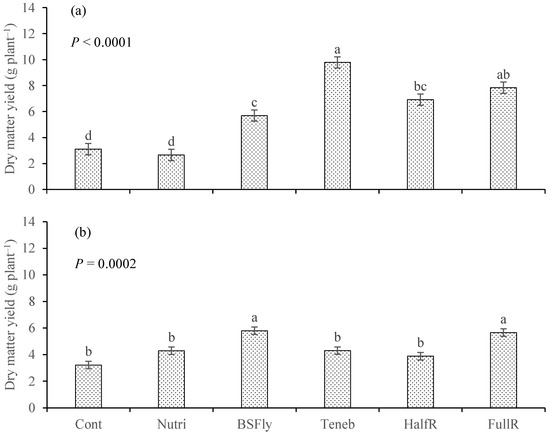 Dry matter yield of lettuce across fertilization treatments [control (Cont), Nutrimais (Nutri), black soldier fly larvae frass (BSFly), mealworm larvae frass (Mealw), half the rate ammonium nitrate (HalfR), full rate of ammonium nitrate (FullR)] in the second growing cycle, in pots that received (a) and did not receive (b) the second dose of organic amendments and fertilizers. Means with the same letter are not significantly different (Tukey’s HSD test, α = 0.05). Vertical bars represent standard errors.