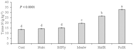 The N concentration in the tissues of lettuces grown during the first growing cycle followed a slightly different pattern from DMY (Figure 4). The highest values were observed in the FullR treatment (33.0 g plant−1), followed by HalfR (26.5 g kg−1), and Mealw (19.6 g kg−1). The mean values observed in the BSFly (15.2 g kg−1) and Nutri (14.4 g kg−1) treatments did not differ significantly from those observed in the Cont treatment (13.6 g kg−1).