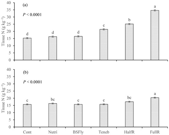 Nitrogen (N) concentration in lettuce tissues across fertilization treatments [control (Cont), Nutrimais (Nutri), black soldier fly larvae frass (BSFly), mealworm larvae frass (Mealw), half the rate ammonium nitrate (HalfR), full rate of ammonium nitrate (FullR)] in the second growing cycle, in pots that received (a) and did not receive (b) the second dose of organic amendments and fertilizers. Means with the same letter are not significantly different (Tukey’s HSD test, α = 0.05). Vertical bars represent standard errors.