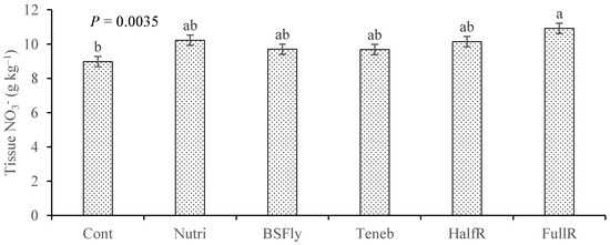 Nitrate (NO3−) concentration in lettuce tissues across fertilization treatments [control (Cont), Nutrimais (Nutri), black soldier fly larvae frass (BSFly), mealworm larvae frass (Mealw), half the rate ammonium nitrate (HalfR), full rate of ammonium nitrate (FullR)] in the first growing cycle. Means with the same letter are not significantly different (Tukey’s HSD test, α = 0.05). Vertical bars represent standard errors.