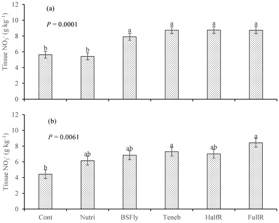 Nitrate (NO3−) concentration in lettuce tissues across fertilization treatments [control (Cont), Nutrimais (Nutri), black soldier fly larvae frass (BSFly), mealworm larvae frass (Mealw), half the rate ammonium nitrate (HalfR), full rate of ammonium nitrate (FullR)] in the second growing cycle, in pots that received (a) and did not receive (b) the second dose of organic amendments and fertilizers. Means with the same letter are not significantly different (Tukey’s HSD test, α = 0.05). Vertical bars represent standard errors.