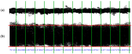 We conducted a thorough investigation of each of the three rows in two separate runs, capturing data from both sides of the canopy. This dual-run approach allowed for a comprehensive analysis. Point clouds generated from the recorded data were meticulously matched to enhance accuracy (Figure 1a). Data recording occurred continuously along 100 m of each row, with calculations performed at 70 cm intervals to extract key canopy metrics. Canopy width, canopy area, and row volume were determined at 70 cm intervals. For the calculation of the area coverage index (ACI), the point cloud was delimited to 160 cm height sections (see Figure 1b).
