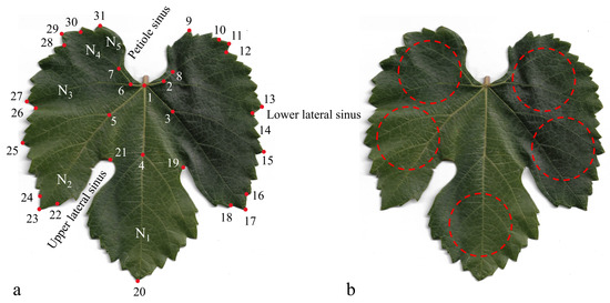 (a) Basic ampelometric features: midvein is N1, distal/superior lateral vein is N2, proximal/inferior lateral vein is N3, petiolar vein is N4, and sinuses (petiolar sinus, lower lateral sinus, upper lateral sinus) with the position of the 31 biometric landmarks (b) and leaf colorimetric evaluation of the samples, where the red circles indicate the position and size of the sampling area.