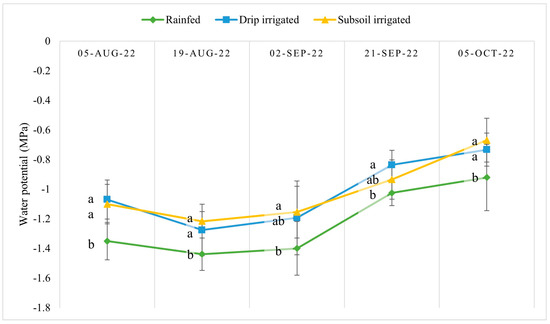 Seasonal patterns of stem water potential (stem ψ) during the vegetation period in the rainfed, drip-irrigated, and subsoil-irrigated rows. Different letters indicate significant differences at p < 0.05.