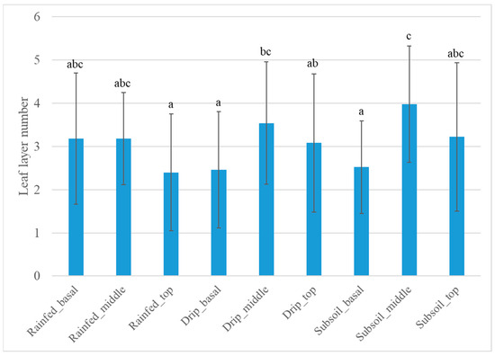 Leaf layer number for the ‘Hárslevelű’ grapevine cultivar in the rainfed, drip-irrigated, and subsoil-irrigated rows in the basal, middle, and top positions according to 50 insertions. The letters indicate significant differences at p < 0.05.