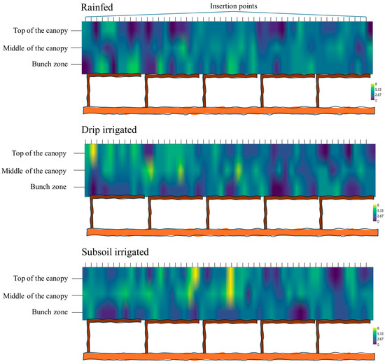 Measurements were taken at three canopy heights: bunch zone, middle third, and top of the canopy. The results showed that the leaf layer number was significantly (p < 0.05) influenced by the positions, but the treatment had no effect if the same heights were compared (Figure 4 and Figure 5). The densest canopy was obtained in the middle of the subsoil-irrigated rows, with four leaves per insertion, while the thinnest canopy occurred at the top of the rainfed row (2.4 leaves per insertion). The vertical trend of the density was different among the treatments. In the case of the rainfed row, no significant differences were observed between the three heights. In contrast, the irrigated row showed a significantly denser canopy at the middle than those in the fruit zone. If the leaf layer number data and position of the insertion are not considered, there are no significant differences between the treatments. The mean fruit number in the bunch zone was 1.38, 1.18, and 1.36 bunches per insertion, and the totals were 69, 59, and 68 bunches per 50 insertions in the rainfed, drip-irrigated, and subsoil-irrigated rows, respectively, without significant differences. The gap number showed low values in all rows. The highest value was recorded in the top position of the canopy in the rainfed row, where the value was 12% (6 gaps out of the 50 insertion).