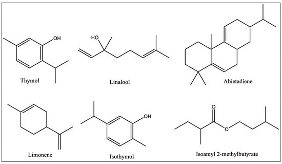 The primary constituents of each essential oil (EO) were determined and measured using mass spectra acquired from a Hewlett–Packard GCD system gas chromatograph–mass spectrometer (GC-MS) (Thermo-Fischer Scientific, Waltham, MA, USA). The chromatographic separation was conducted using an HP Innowax capillary column with dimensions of 60 m × 0.25 mm × 0.25 μm (Agilent, Santa Clara, CA, USA). The oven temperature was programmed to climb at a rate of 4 °C per minute, starting from 50 °C and reaching 200 °C. Helium was employed as the carrier gas, maintaining a consistent flow rate of 1 mL/min. The injection mode was divided. The identification of the EO constituents was achieved by comparing their retention indices, which were determined using the retention times of a range of linear alkanes (C7–C40), with the values documented in existing literature. The obtained mass spectra were subsequently compared to the mass spectra in the NIST library/EPA/NIH mass spectral library, version 2.0 (2002) [,].
