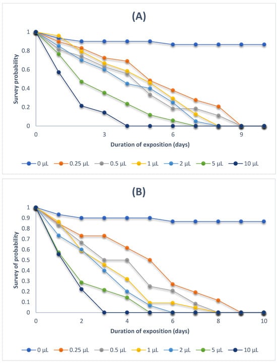 Survival curves of Sitophilus oryzae (adults) treated with EOs. (A) EOs of A. visnaga and (B) EOs of T. ammi.