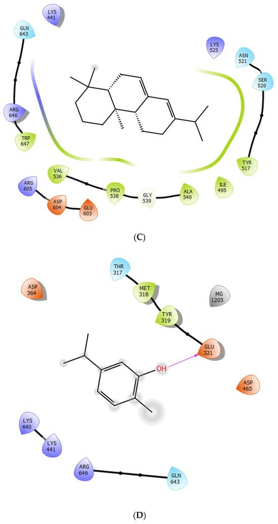 The 2D viewer of ligands’ interactions with the active site. (A,D) Isothymol interactions with the active site of acetylcholinesterase and chitin synthase. (B,C) Abietadiene interactions with the active site of acetylcholinesterase and chitin synthase.