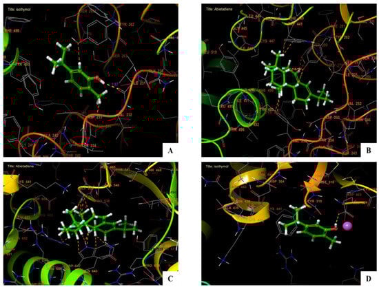 The 3D viewer of ligands’ interactions with the active site. (A,D) Isothymol interactions with the active site of acetylcholinesterase and chitin synthase. (B,C) Abietadiene interactions with the active site of acetylcholinesterase and chitin synthase.