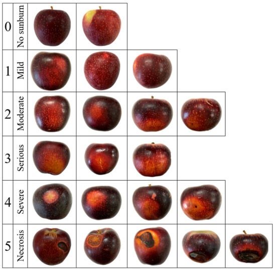 Fruit were assessed for sunburn damage on a scale of zero (no sunburn damage) to five (necrosis; Figure 1). FD was measured using a Bluetooth calliper (OriginCal, iGAGING, San Clemente, CA, USA) integrated with a smartphone app (IDT DataLogger, ID Tools, Rowville, Australia) to log the collected values. Destructive assessments of internal quality parameters flesh firmness (FF) and soluble solids concentration (SSC) were performed, respectively, with a penetrometer (FT327, FACCHINI srl, Alfonsine, Italy) using an 11 mm probe and a digital refractometer (PR-1; Atago Co., Ltd., Tokyo, Japan). Measurements of both parameters were performed on two opposing sides of the fruit and the mean values calculated. Following this, a transverse cut was made to remove the bottom half of the fruit, which was then placed cut surface up and sprayed with a solution of potassium iodide (1% w/v) and iodine crystals (0.15% w/v). Fruit were visually assessed after ten minutes for SPI on a scale of one (high starch) to six (low starch).