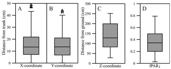 Boxplots for (A) X-, (B) Y- and (C) Z-coordinates (distance from the trunk) and (D) the fraction of transmitted photosynthetically active radiation (fPARi). Horizontal lines show sample medians. Lower whiskers show the interquartile range. Triangles show outliers.