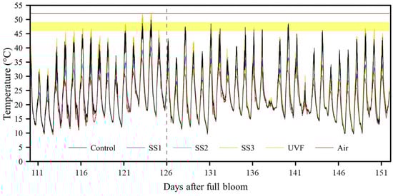 The progression of maximum FST of the different light exposure treatments can be observed in Figure 3. There were several days during the monitoring period when the FST of the sun-exposed treatments reached the one-hour threshold for sunburn browning development. The UVF-treated fruit reached maximum FSTs of 51.9 and 52.5 °C at 123 and 124 DAFB, respectively, which is over the ten-minute threshold for sunburn necrosis (52.2 ± 1 °C; Figure 4).