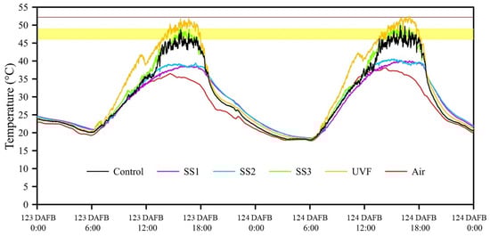 Recorded air temperature and maximum sample FST of sample fruit under different light exposure treatments from 123 to 124 DAFB. The yellow area represents the minimum one-hour threshold region for sunburn browning development (46.1–48.9 °C) and the brown line represents the 10-min threshold for sunburn necrosis (52.2 ± 1 °C) according to Schrader et al. (2001) [19].