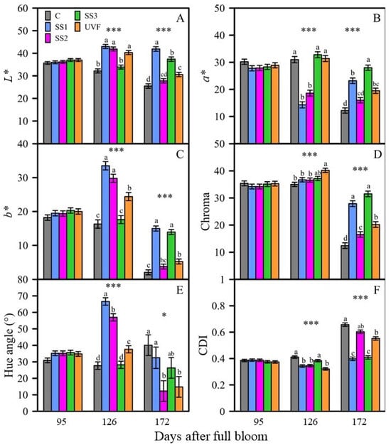 The CDI value of UVF-treated fruit initially grouped with that of the shaded fruit at 126 DAFB (0.321) but then increased (0.552) to be similar to that of the exposed SS2 (0.603) at harvest (p > 0.05).