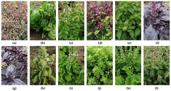 Basil genotypes: (a) O. basilicum ‘Aromă de cuișoare’; (b) O. basilicum ‘Aromă de trandafir’; (c) O. basilicum ‘Aromat de Buzău’; (d) O. basilicum ‘Ierusalim’; (e) O. basilicum ‘L7’; (f) O. basilicum ‘L10’; (g) O. basilicum ‘L12’; (h) O. basilicum ‘L50’; (i) O. basilicum f. bulatum; (j) O. basilicum f. minimum; (k) O. basilicum var. crispum; and (l) O. citriodorum ‘Macedon’; (original).