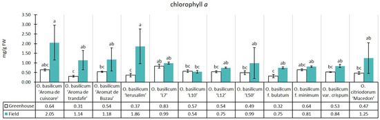 Chlorophyll a content in greenhouse and open-field basil plants; median ± median absolute deviation (mg/g Fresh Weight). Similar letters indicate that differences between variants are not significant (Dunn test).