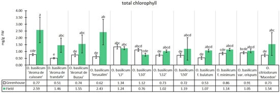 Total chlorophyll content in greenhouse and open-field basil plants; median ± median absolute deviation (mg/g Fresh Weight). Similar letters indicate that differences between variants are not significant (Dunn test).