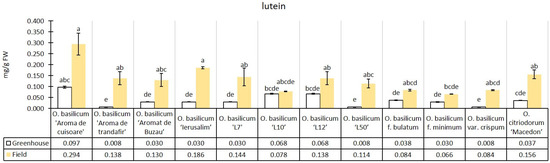 Lutein content in greenhouse and open-field basil plants; median ± median absolute deviation (mg/g Fresh Weight). Similar letters indicate that differences between variants are not significant (Dunn test).