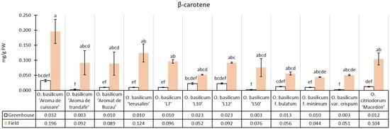 The β-carotene content in greenhouse and open-field basil plants; median ± median absolute deviation (mg/g Fresh Weight). Similar letters indicate that differences between variants are not significant (Dunn test).