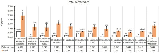 Total carotenoids content in greenhouse and open-field basil plants; median ± median absolute deviation (mg/g Fresh Weight). Similar letters indicate that differences between variants are not significant (Dunn test).