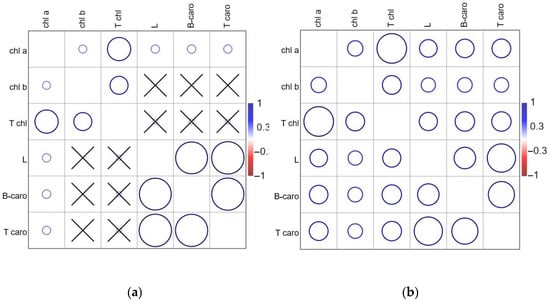Kendall tau coefficients (τ) for the plants in the greenhouse (a) and plants in the field (b). The size of the bubble is proportional to the coefficient value; crossed “×” is not significant at α 0.05; chl a—chlorophyll a; chl b—chlorophyll b; L—lutein; B-caro—β-carotene; T chl—total chlorophyll; T caro—total carotenoids.