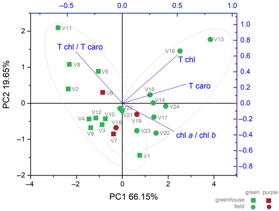 Biplot of principal components for photosynthetic leaf pigments of twelve basil genotypes in greenhouse (square points) and field (round points); T chl—total chlorophyll; T caro—total carotenoids; chl a/chl b—chlorophyll a to chlorophyll b ratio; T chl/T caro—total chlorophyll to total carotenoids ratio.