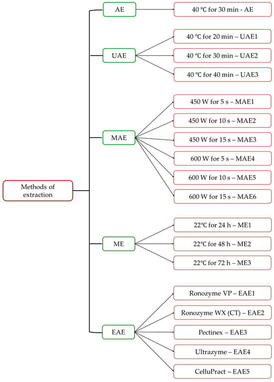 The following aspects were taken into account in choosing the methods of extraction of bioactive compounds: the biological material on which we carried out the experiments (phenolic compounds from fruits are not difficult to extract, in general), the simplicity of the method and obtaining high extraction yields, the possibility of applying the method at an industrial level, the costs, and the impact on the environment, which should be as low as possible. The choice of extraction method consisted in testing five methods: extraction with continuous agitation (AE), ultrasound-assisted extraction (UAE), microwave-assisted extraction (MAE), maceration extraction (ME), and enzyme-assisted extraction (EAE). The same sample/solvent ratio and ethanol percentage were used for all the tested methods. The extraction parameters were established based on data from the scientific literature [42,43,44,45,46,47,48,49], with some modifications for experimental purposes. This resulted in 18 extracts, as shown in Figure 1. All the obtained samples were subsequently filtered using Whatman filter paper (Sigma-Aldrich, Merck KGaA, Darmstadt, Germany) and stored at a temperature of 2–4 °C for chemical analyses.